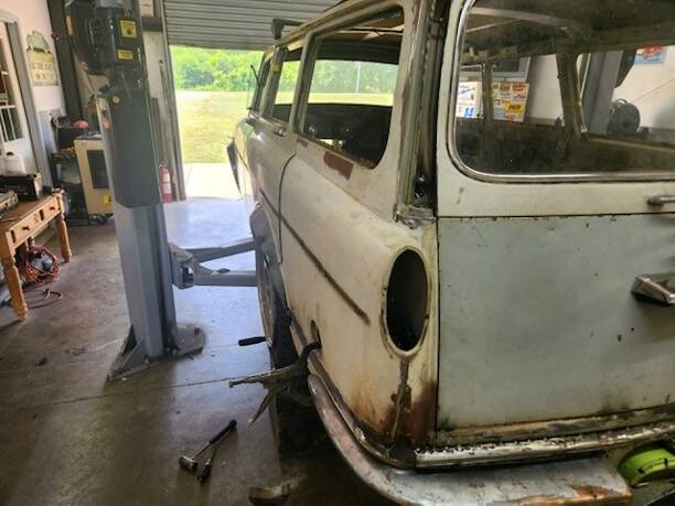 Here is another view of the finished size clamped on. They will be butt welded. We really like the shape and how it fits the curve of the body. It looks like what the factory would produce if they were making the Estate today. We also like the fact that we have metal fender flares. Total cost for flare parts was $300. Plenty of room for a 8" or 8.5" tire without modifying the rear inner tubs.