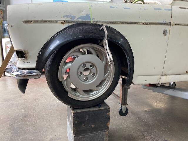 After a lot of on-line research we decided on the metal fender flares that are original equipment on a Dodge Horizon. After a few weeks we found some in Florida and we were in luck - the gent had two front left fenders and two front right fenders - exactly what we needed. He cut and shipped them and as soon as the box arrived we taped one on to the side of the car. To say that they will need a little fitting is an understatement, but so far so good.